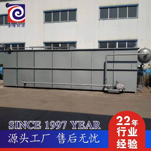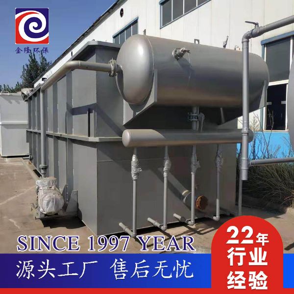 使用水泵从调节池将原污水提升到絮凝反应池。絮凝剂从进水管(泵前)投入,并经叶轮混合于反应池中进行絮凝,根据废水的性质不同反应池的强度和反应时间应有所调整。反应后的絮凝水进入气浮池的接触区域,并与从溶气释放器释放的溶气水相混合。此时,水中的絮状物和微泡相互碰撞并粘附,与空气一起形成絮状物并向上漂浮,并且在分离区域中进行固液分离。漂浮到水面的污泥被刮渣器刮到排渣罐并排出。清水从穿孔集水管收集到集水槽后流出。有些清水经由回流水泵加压后进入溶气罐,在罐内与空气压缩机相互接触溶解,饱和的溶气水从罐底通过管道输入释放器。